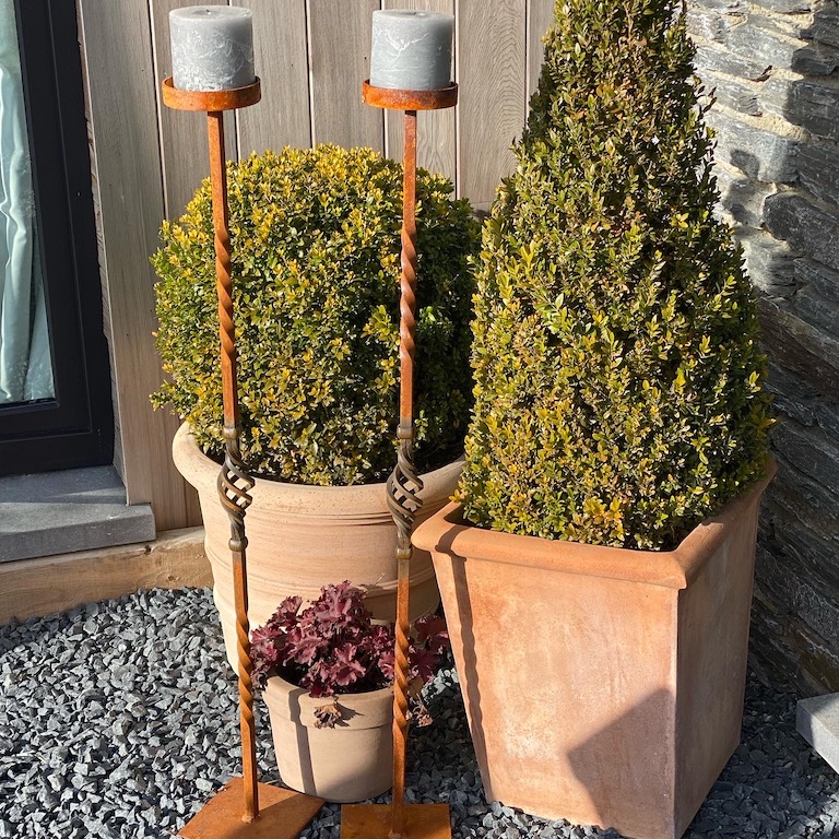 Des luminaires, bougeoirs, photophores… imaginés par mes soins et élaborés en étroite collaboration avec un artisan ferronnier (Milicandesign) et un artisan tailleur de pierres.